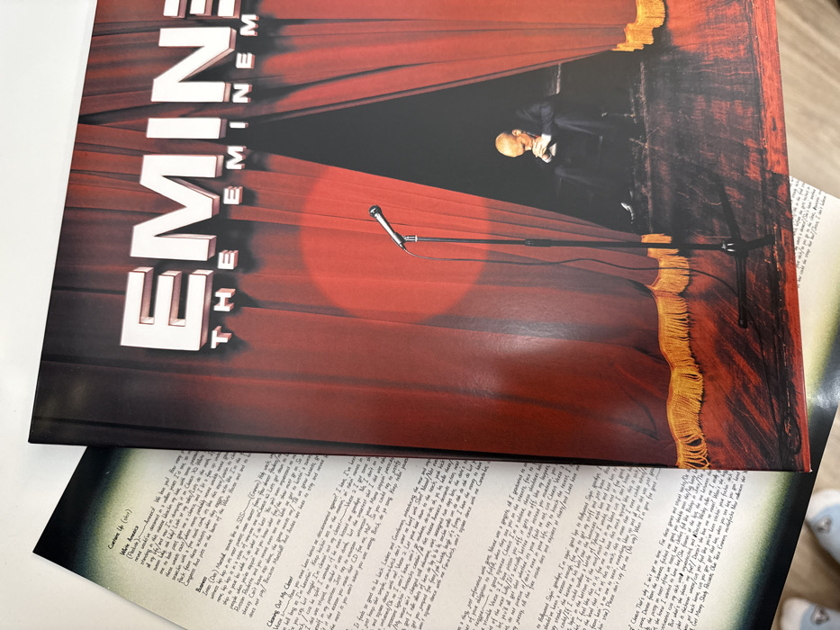 The image displays an "Eminem The Eminem Show" record album cover, positioned on a light-colored flat surface
