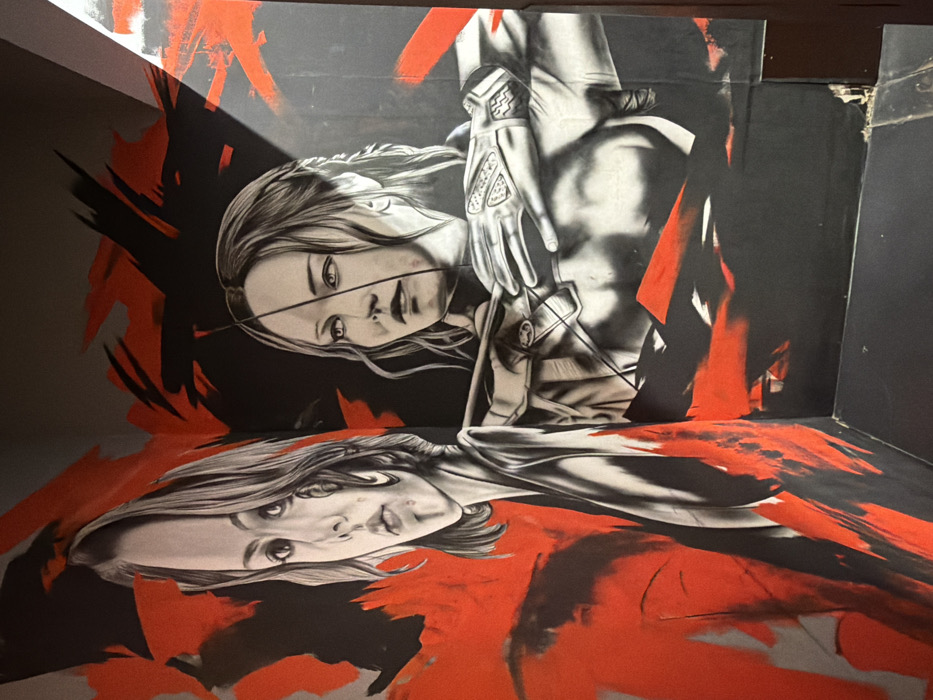 A large mural spans an interior corner of a structure in Ulm, Germany. The artwork features two distinct female figures rendered in grayscale against a dynamic background of black and prominent red abstract slashes. On the left wall, the mural depicts a female figure with shoulder-length wavy hair, resembling Scarlett Johansson, gazing directly forward with an elongated, stylized face. She wears dark clothing, and her upper torso is visible. The background immediately surrounding her is a mix of black and red, with the red forming irregular, sharp-edged shapes. On the adjacent right wall, another female figure, resembling Jennifer Lawrence as Katniss Everdeen, is depicted in profile, looking to her right (viewer's left). She is actively drawing a bowstring with an arrow nocked, her left hand gripping the bow and her right hand pulling the string. She wears an arm guard on her left forearm, detailed with geometric patterns. Her hair is styled in a braid or pulled back. The background behind her is similarly composed of black and red abstract elements. The artwork covers the full height of the visible wall section, extending down to a dark, flat surface or floor. The junction of the two walls forms a 90-degree angle, with the artwork seamlessly transitioning across the corner.