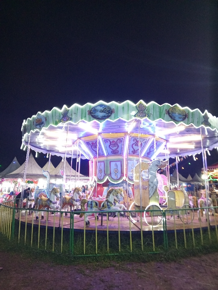 - "A vibrant, illuminated carousel with painted horses and a carriage stands under a dark night sky" by FM-2Dvqu1, licensed under CC BY 4.0
