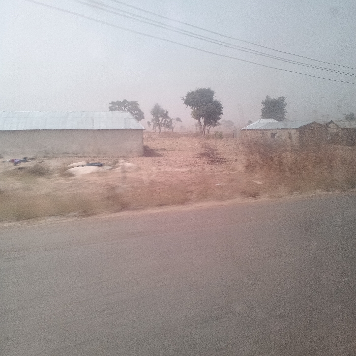 The image depicts a rural or semi-urban roadside scene in Kudaru, Nigeria, under hazy or dusty atmospheric conditions