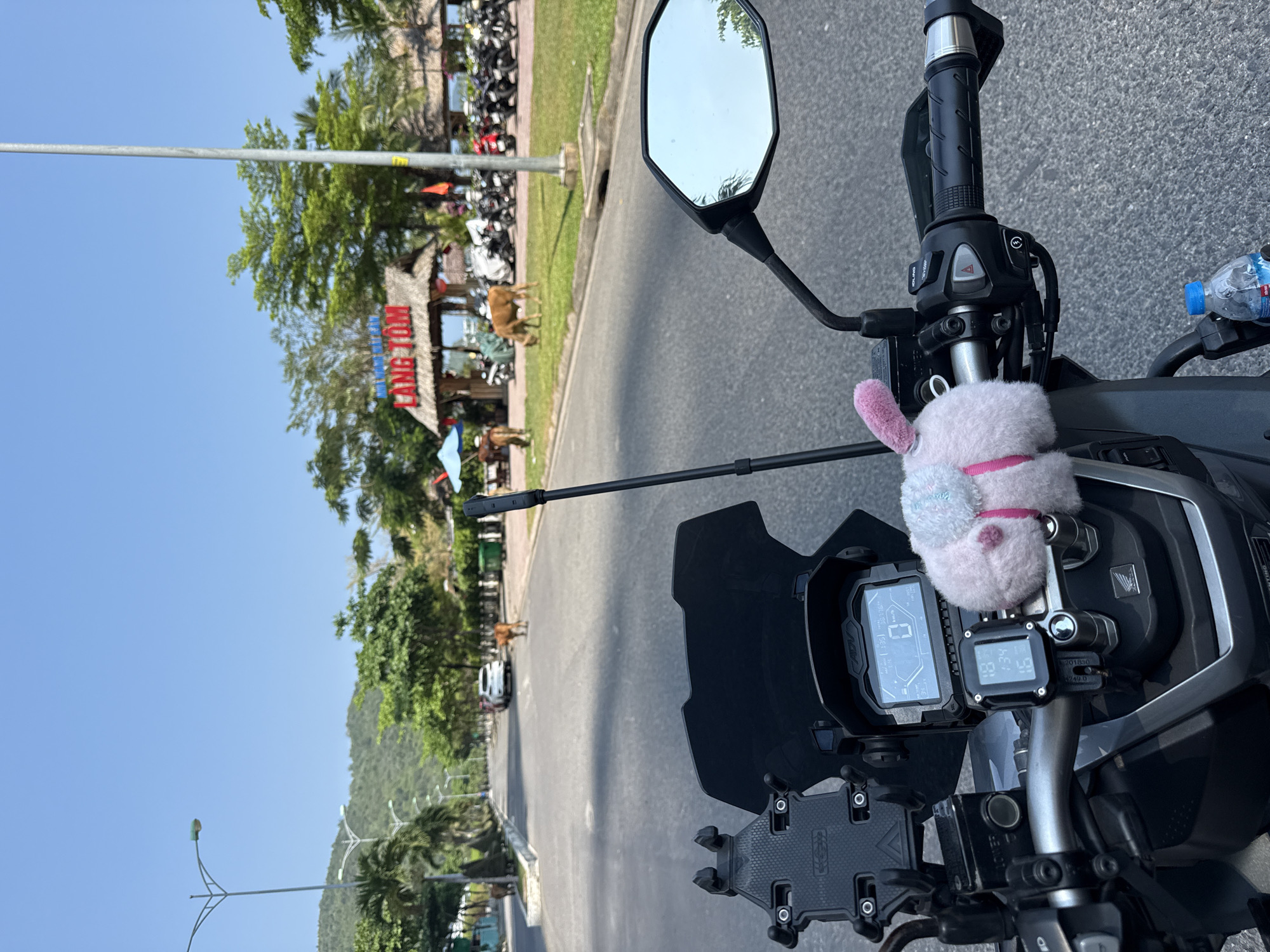 view from the handlebars of a motorcycle, likely parked, on a road in Unknown, Vietnam. The road is bordered by a curb, grass, and trees. Across the road, there's a building labeled "LANG TOM", possibly a business or landmark. A few cows are grazing on the grass in front of the building. In the background, there are parked motorcycles. The motorcycle's dashboard, including the speedometer and other instruments, is visible, and a fuzzy pink and white object is attached to the handlebar. A smartphone mount is visible as well. The sky is clear and blue.