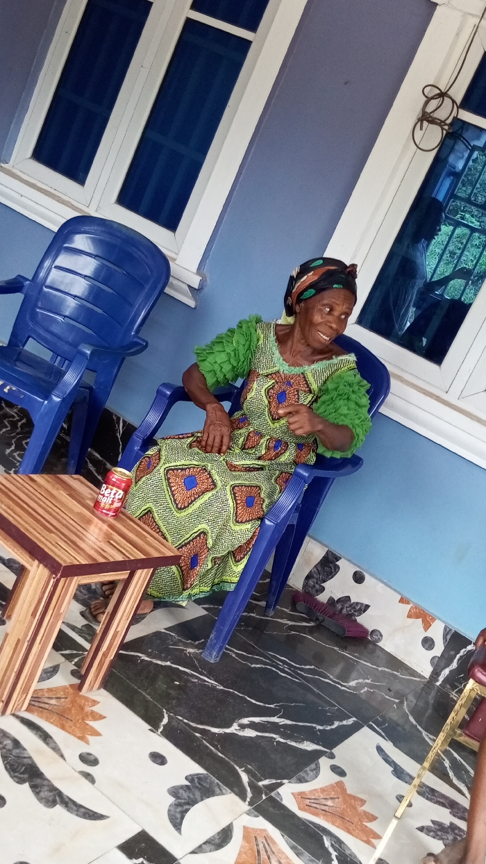 An elderly woman sits smiling and pointing in a blue plastic armchair on a patterned tiled floor, in what appears to be a covered outdoor area or porch in Unknown, Unknown