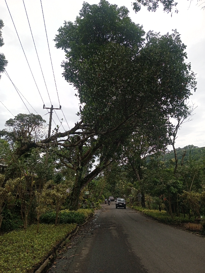 The image depicts a two-lane asphalt road traversing a densely vegetated, semi-rural environment in Hasanparthy mandal, India, under an overcast sky. A prominent, large tree with a thick, dark green canopy and robust, moss-covered branches dominates the left side, extending over the roadway. A utility pole with multiple overhead power lines is visible on the upper left, positioned behind the large tree. The road surface appears dark and possibly damp. Approaching in the right lane is a dark-colored SUV, followed by a motorcycle, and then another dark vehicle further in the distance. Lush green undergrowth and smaller trees line both sides of the road, which curves gently into the background where forested hills are visible. No pedestrians are discernible.