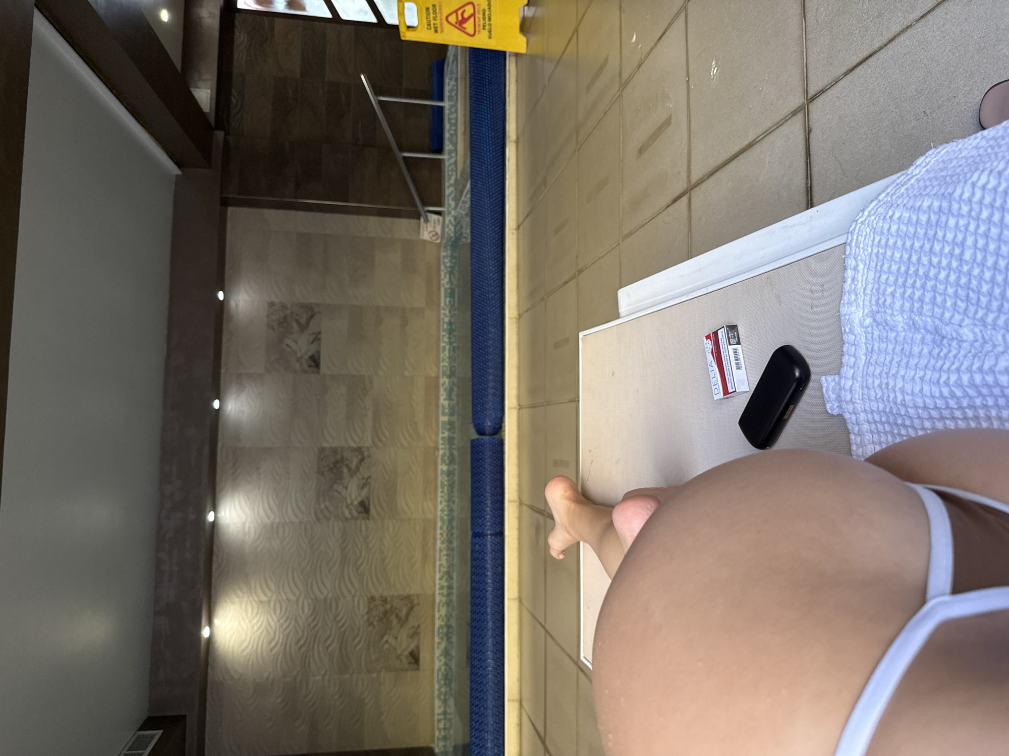 A vertical, high-angle indoor shot shows a person’s buttocks in brown and white bikini bottoms sitting on a lounge chair beside a swimming pool, next to a pack of cigarettes and a mobile phone. A towel is partially visible behind the person. The swimming pool is long and narrow, bordered by blue padded mats on the sides. A yellow “Caution Wet Floor” sign is visible near one end of the pool. The walls are tiled. It is unknown if this is in the city of Marchevo, Bulgaria.