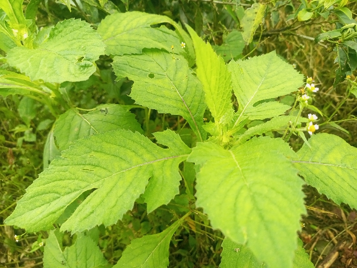 The image displays a close-up view of a plant with numerous green leaves in Pacet, Indonesia. The leaves are predominantly light to yellowish-green, varying in shape from ovate to irregularly lobed with serrated margins. Visible venation on the leaves includes a central reddish-purple vein on the underside of some leaves. Multiple leaves exhibit small, irregular perforations and edge damage, indicative of insect activity or environmental wear. In the background and towards the right, several small white flowers with yellow centers are visible on slender green stems. The surrounding area consists of blurred green foliage, suggesting a dense natural or wild vegetated environment. The scene is illuminated by natural, diffused daylight. No human subjects or man-made objects are present.
