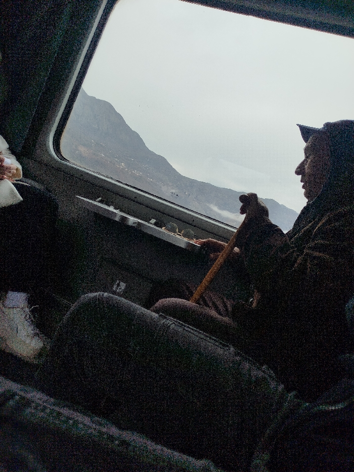 The image depicts the interior of a vehicle, likely a train, with a large window offering a view of a mountainous landscape under an overcast sky. The precise location in a city is Unknown, Unknown; the exterior shows a natural, rugged environment. A person, an adult, is visible on the right side of the frame, in profile, facing left and observing the external scenery through the window. This individual is wearing a dark hooded garment and a dark cap. Their left hand holds a light-brown, cylindrical object, consistent with a stick or cane. A pair of sunglasses rests on a narrow horizontal ledge below the window, situated near the person's right hand. On the far left, a portion of another person's lower leg, clad in dark trousers, and a white shoe are visible. The vehicle's interior appears dimly lit, providing a contrast to the brighter, grey sky and distant, rocky mountains visible through the window. The mountain slopes display sparse vegetation, and portions of the distant landscape are obscured by haze or low clouds. The window frame is dark grey.