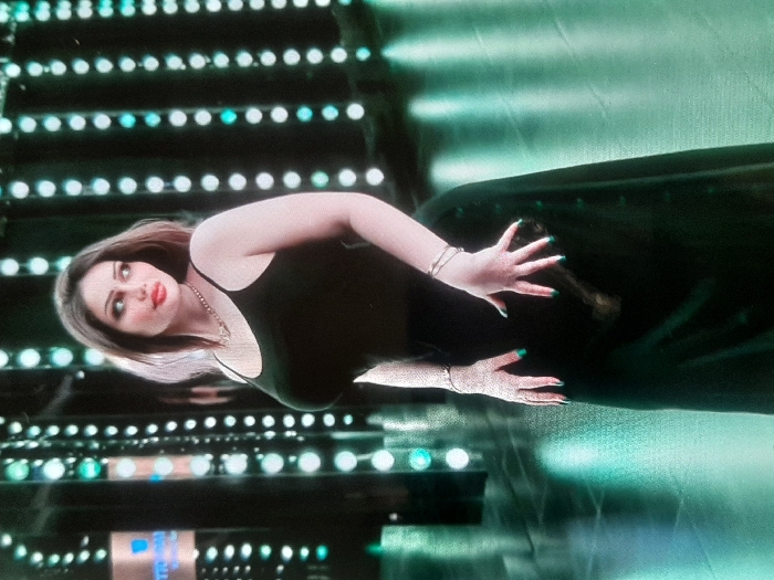 A female subject is depicted standing in Barza Municipality, Syria, positioned with her body angled slightly away from the camera, looking over her right shoulder. She possesses long, dark brown hair and wears prominent eye makeup and red lipstick. Her attire consists of a black spaghetti-strap camisole and a long, dark green skirt with vertical button detailing on its left side. She accessorizes with a thin silver-colored chain necklace featuring an indistinct pendant, and thin silver-colored bangles on both wrists. Her fingernails are painted bright green; her left hand is raised with fingers splayed, while her right hand is lower, also with fingers slightly spread. The background features vertical rows of circular lights, some appearing white/silver and others cyan, against a dark backdrop. A reflective, dark floor shows distorted reflections of these lights, and a partially obscured metallic sign with blue elements is visible in the upper left background.