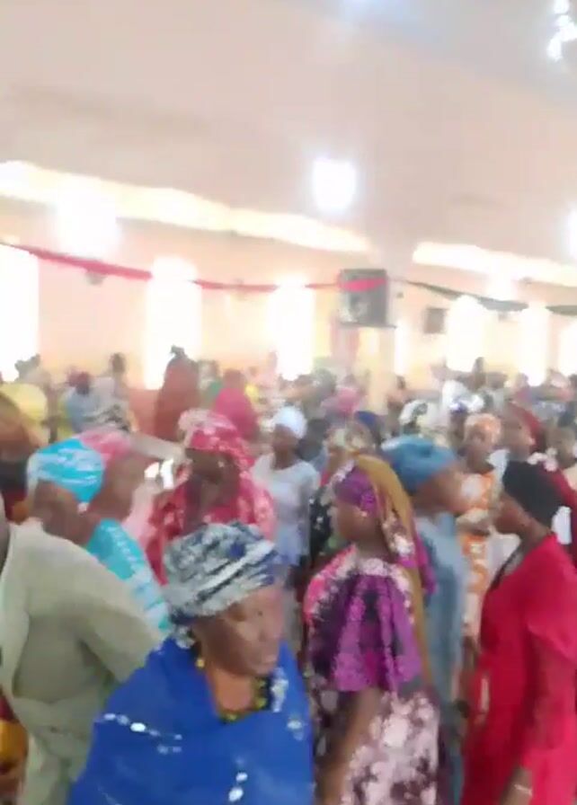 The video depicts a gathering inside a large hall with many people dressed in colorful traditional clothing