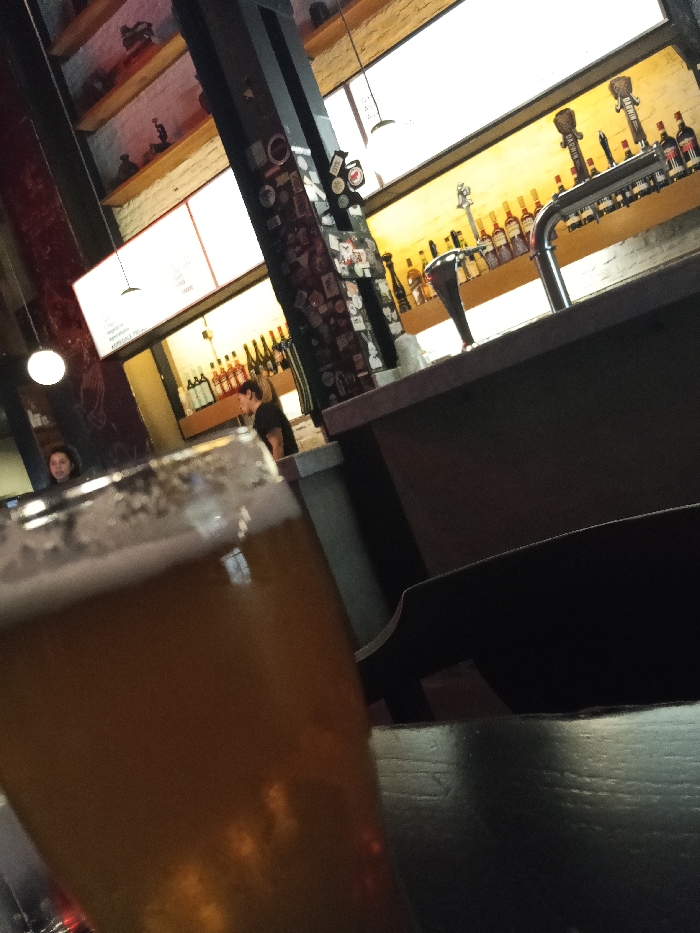 A glass of amber-colored liquid, likely beer, occupies the foreground