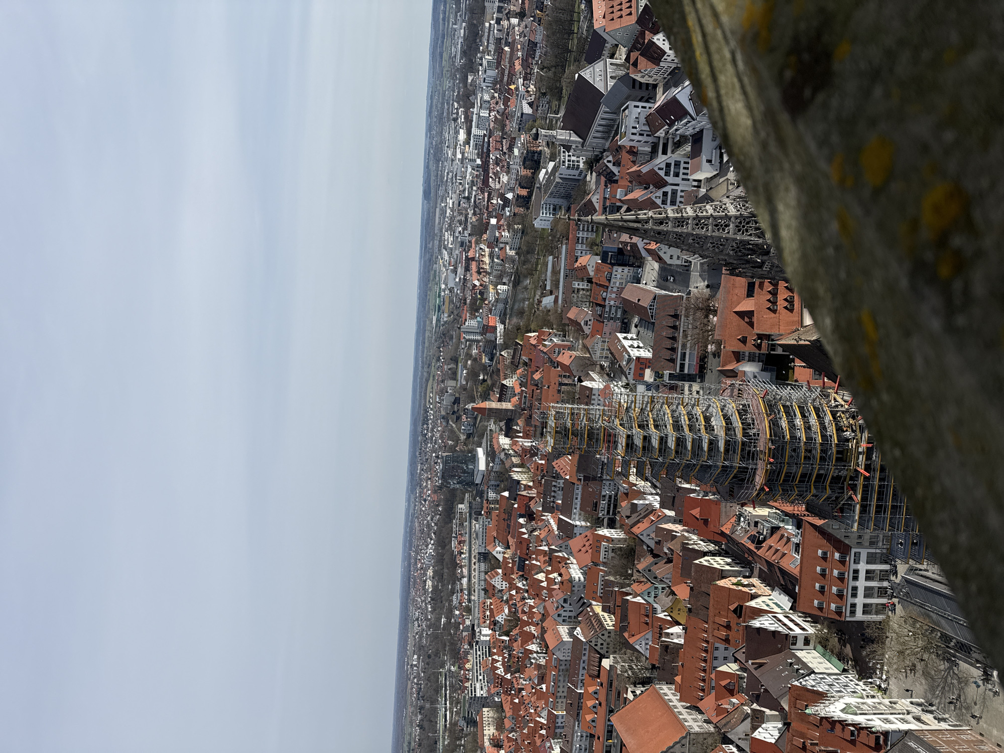 This image presents a high-angle aerial view of the city of Ulm, Germany, on a clear day, captured from a significant elevation, likely from an adjacent tall structure. In the immediate foreground, a dark, rough-textured stone ledge or parapet, out of focus and displaying patches of yellow and green lichen, partially obscures the lower right quadrant of the scene. The mid-ground is dominated by the dense urban fabric of Ulm, characterized by numerous buildings with predominantly terracotta-red gabled roofs and light-colored facades. A prominent, slender, conical stone spire, heavily encased in multi-level scaffolding with yellow safety netting and metal framework, rises vertically near the center of the composition. This structure is identifiable as the spire of the Ulm Minster (Ulmer Münster), indicating ongoing maintenance or construction. Adjacent to the Minster, intricate Gothic architectural details of another part of the church are visible on the right. Below and to the left of the scaffolding-wrapped spire, a public square and streets are visible, populated by numerous small, discernible human figures indicating pedestrian activity. Vehicles are also present on the visible roadways. The surrounding cityscape features a mix of historical buildings with varied rooflines and some more modern, rectilinear structures. Further into the background, the city extends horizontally, transitioning into more suburban and industrial areas. Green spaces and treelines are interspersed throughout the urban environment, and a river (likely the Danube) can be observed winding through the landscape. The distant horizon is characterized by a flat expanse of land and a pale blue, hazy sky with minimal cloud cover. The scene is illuminated by bright daylight, casting distinct shadows on the buildings.
