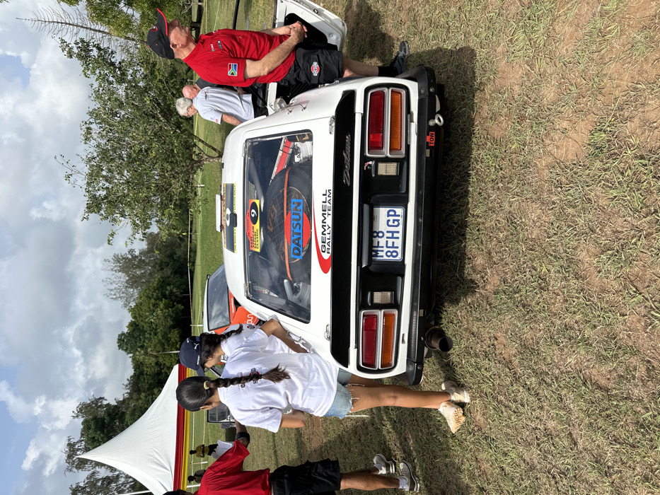 The image displays an outdoor scene in Gombato Bongwe ward, Kenya, featuring a gathering around rally vehicles on a grassy field under a partly cloudy sky. The primary subject is a white Datsun rally car, viewed from the rear. It features a South African license plate "MF8 8FH GP", a black rear spoiler, and an exposed exhaust pipe. The rear window displays a spare wheel, a "DATSUN" logo, "GEMMELL RALLY TEAM" branding, a yellow number "9" circle, and text indicating "EAST AFRICAN CLASSIC" and "THE MILES RALLY". A red "TOW" sticker and a white tow hook are present on the lower right rear bumper. Several individuals are positioned around the Datsun. To the immediate left, a person wearing a red shirt and black shorts is partially visible. Adjacent to the car's left rear are two young females: one with a long braid wears a white t-shirt, denim shorts, and light-colored sneakers; the other, slightly behind, wears a white t-shirt and a dark baseball cap. Both are observing the car. To the right of the Datsun, a man in a red polo shirt with a South African flag patch, black shorts, and a black baseball cap stands beside the car's open passenger door, looking towards the right. Two additional men are partially visible in the mid-background behind the car. In the mid-ground, a large white conical tent with red and yellow striped trim is visible to the left. An orange rally car is partially obscured behind the white Datsun. The ground is covered with dry, sparse grass and exposed dirt patches. Various trees with green foliage populate the background, and a yellow rope or tape delineates an area in the mid-background.