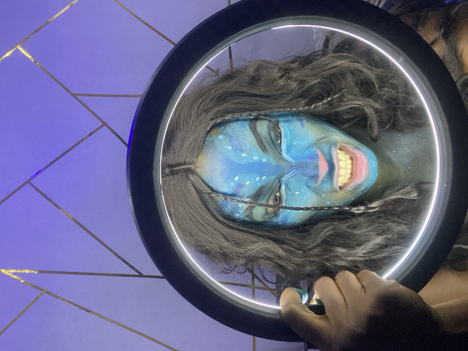 A ring light illuminates a person in Avatar-inspired makeup