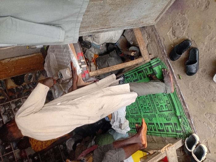Within a cluttered indoor or semi-enclosed space in Sharada, Nigeria, a male individual is depicted from a high angle, positioned with his back mostly to the camera, engaged in ironing. He wears a light-colored, long-sleeved tunic over dark trousers and is barefoot, standing on a green mat with a dark geometric pattern. His right hand operates a silver-colored iron on a light-colored garment draped over a patterned blanket (red, black, white stripes) covering a low, wooden-framed surface. His left hand flattens the fabric being ironed. To the immediate left, the lower legs and feet of another barefoot individual, wearing light-colored shorts, are visible, also standing near or on the green mat. In the background, to the far left, a third individual is partially visible wearing a patterned top. The floor is a rough, uneven concrete surface. Two pairs of black slide sandals are discarded on the concrete floor, one pair featuring white soles. The environment is characterized by significant clutter, including numerous bags (possibly sacks) and various items beneath the ironing surface and in the background. A light-colored garment hangs partially visible on the right, and a plastic bottle is discernable further in the background. Shelving with items is also visible in the upper background.