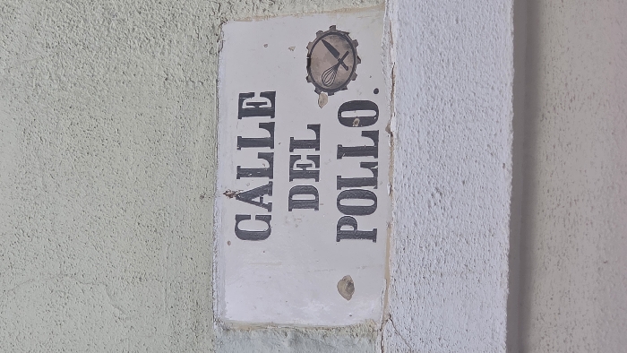 A close-up, vertically oriented photograph depicts a weathered white rectangular street sign affixed to a textured, light green stucco building wall in Valencia, Spain. The sign displays the Spanish text "CALLE DEL POLLO" in black uppercase sans-serif lettering. To the right of the text, a circular emblem features a black outline of a whisk and a chef's knife, positioned against a background resembling cogs or gears. The sign itself shows signs of age, with chipped paint along its bottom edge and a noticeable circular chip on the left side. Beneath the sign, a horizontal white textured ledge protrudes from the wall, also exhibiting peeling paint. Below this ledge, a section of lighter-colored, textured wall is visible. No individuals, actions, or interactions are present in the scene.