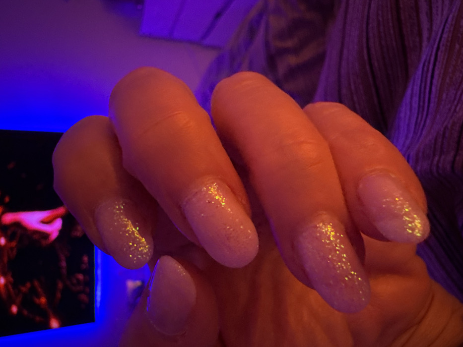 - "A close-up showcases a hand with oval-shaped nails, each adorned with a light pink or beige base and a shimmering glitter effect" by FM-4BMmE2, licensed under CC BY 4.0