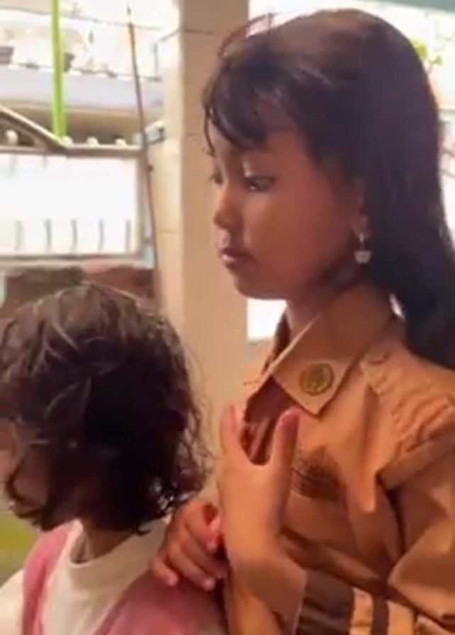 Two young girls are looking at a pond outside. One of the girls is wearing a school uniform. The other girl is wearing a pink vest over a white shirt. The pond has several koi fish, rocks, and plants around it.