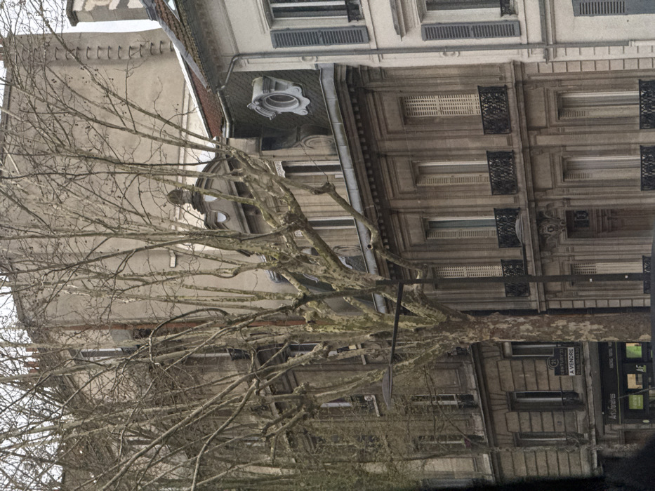 The image presents an urban street scene in Boulogne-Billancourt, France, under overcast lighting conditions. The foreground is dominated by the skeletal branches and mottled bark of several bare deciduous trees, suggesting a late autumn or winter season. Behind the trees, a series of multi-story buildings with traditional French architecture line the street. The primary visible structures are built of light-colored stone or stucco, exhibiting a range of grey, beige, and off-white tones. From left to right: On the left, a multi-story building displays windows with light-colored shutters. A black "CENTURY 21 À VENDRE" sign, indicative of a property for sale, is affixed to its facade, partially obscured by a tree trunk. Below it, a ground-floor commercial space features the sign "Artifenêtres". Adjacent to this, a central building features more elaborate details, including ornate cornices, decorative window frames, and several windows with light-colored vertical slat shutters. The second floor boasts multiple small balconies with intricate black wrought-iron railings. A large wooden entrance door is visible at ground level. Above, the roofline includes a prominent dormer window with an ornate, circular oculus frame. Another, more classically styled dormer is visible further left. To the right, a section of a lighter-colored building, possibly white, is visible with dark grey louvered shutters on its windows. A black streetlamp with a horizontal arm extends across the mid-ground, positioned between the trees and the buildings. No individuals are visible in the scene.