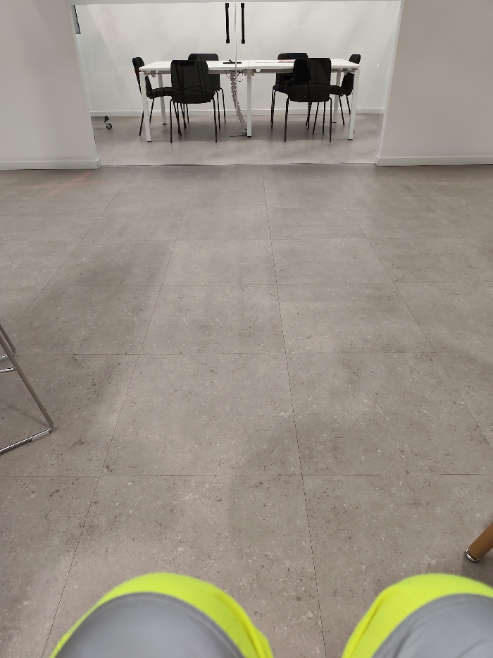 The image captures an interior scene in Cerdanyola del Vallès, Spain, from a low, first-person perspective. In the immediate foreground, the upper legs of an individual are visible, clad in grey trousers featuring prominent neon yellow-green reflective bands. The floor consists of uniform, light beige-grey speckled tiles. Partially visible on the left is a chrome chair leg, and on the right, a light wooden chair leg. Beyond the foreground, a modern office or meeting room is visible through an open doorway or a transparent partition. This room has stark white walls and a consistent tiled floor. Centrally positioned within this room is a large, rectangular white table with white legs. Six black, minimalist-designed chairs are arranged around the table; four are clearly visible along the longer sides, and two are partially visible at the ends. A white power strip or cable management system is located on the table's surface, with black cables descending from it. Two prominent black vertical fixtures, possibly door handles or framing elements, are visible against the far wall of the room. To the far left of the room, a white wheeled cart is partially visible against the wall. No individuals other than the implicit photographer are present in the frame.