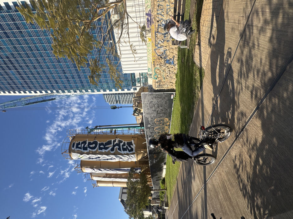The image depicts an urban landscape in Tel Aviv, Israel, specifically in the vicinity of the Reading Power Station, characterized by industrial remnants, active construction, and public recreational areas under a clear, sunny sky with scattered white clouds. In the foreground, a paved pathway with two embedded parallel metal tracks, consistent with a tram or light rail line, stretches diagonally across the scene. Long, distinct shadows from overhead trees stripe the pathway. A person, wearing a black helmet, a dark long-sleeved shirt with a light graphic on the back, and blue jeans, rides a black electric bicycle away from the viewer on this path. A black bag is attached to the bicycle's handlebars. To the right of the path, on a patch of green grass, a second individual is seated on a wooden park bench, hunched over an object in their hands. This person wears a light-colored t-shirt and camouflage-patterned trousers. The midground features three prominent, rust-colored industrial silos with conical tops. The closest silo displays a large white banner with vertical black graffiti-style Hebrew text, possibly reading "אורנה". A similar, partially obscured banner is visible on the adjacent silo. Behind and to the right of the silos, a green tower crane indicates active construction. Below the silos, a temporary dark grey construction hoarding, covered with intricate black and white graffiti art, borders the work site. Further right, a stone wall is heavily covered with various colorful graffiti tags. In the background, a tall, modern high-rise building with a reflective blue-grid glass facade dominates the skyline on the right. A large white shipping container or modular unit is situated between the construction zone and the base of the high-rise. A tree with sparse, light green foliage stands between the high-rise and the grassy area.