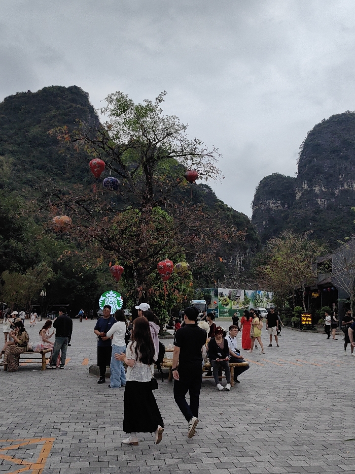 This image depicts a bustling outdoor plaza located in Hoa Lư Ward, Vietnam. The scene is dominated by a grey interlocking paver surface, flanked by steep, heavily vegetated karst mountains under an overcast sky. In the foreground and midground, approximately 30-40 individuals, primarily East Asian adults, are present. People are observed walking, standing in small groups, and sitting on rustic wooden benches scattered across the plaza. A large, partially defoliated tree in the center is adorned with several large, illuminated lanterns in red, blue, and orange, resembling spheres and hearts. Behind this tree, a prominent, illuminated circular green and white Starbucks siren logo is visible. To the right, dark-colored buildings with traditional Vietnamese architectural features are present. In the background, a white passenger van is partially obscured by people, and a large billboard displaying natural landscapes is visible. The attire of individuals is casual, comprising t-shirts, dresses, long skirts, and trousers.