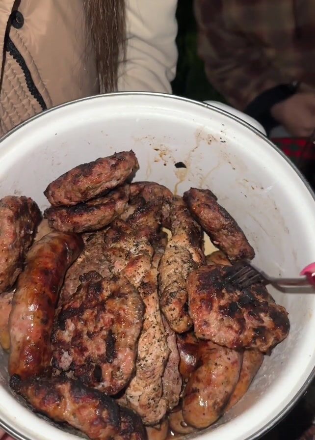 group of people at an outdoor gathering, likely a barbecue. A large white pot full of grilled meats, including sausages and burger patties, is prominently featured. A hand uses a fork to transfer a burger patty from the pot onto a plate that already has another patty on it. The plate is a vintage style, with a white background and a pink floral pattern. Other items on the table include toasted bread, grilled vegetables, salad, and drinks in glasses. The tablecloth is red and green plaid. The people are visible but not clearly identified; they are wearing casual clothing.