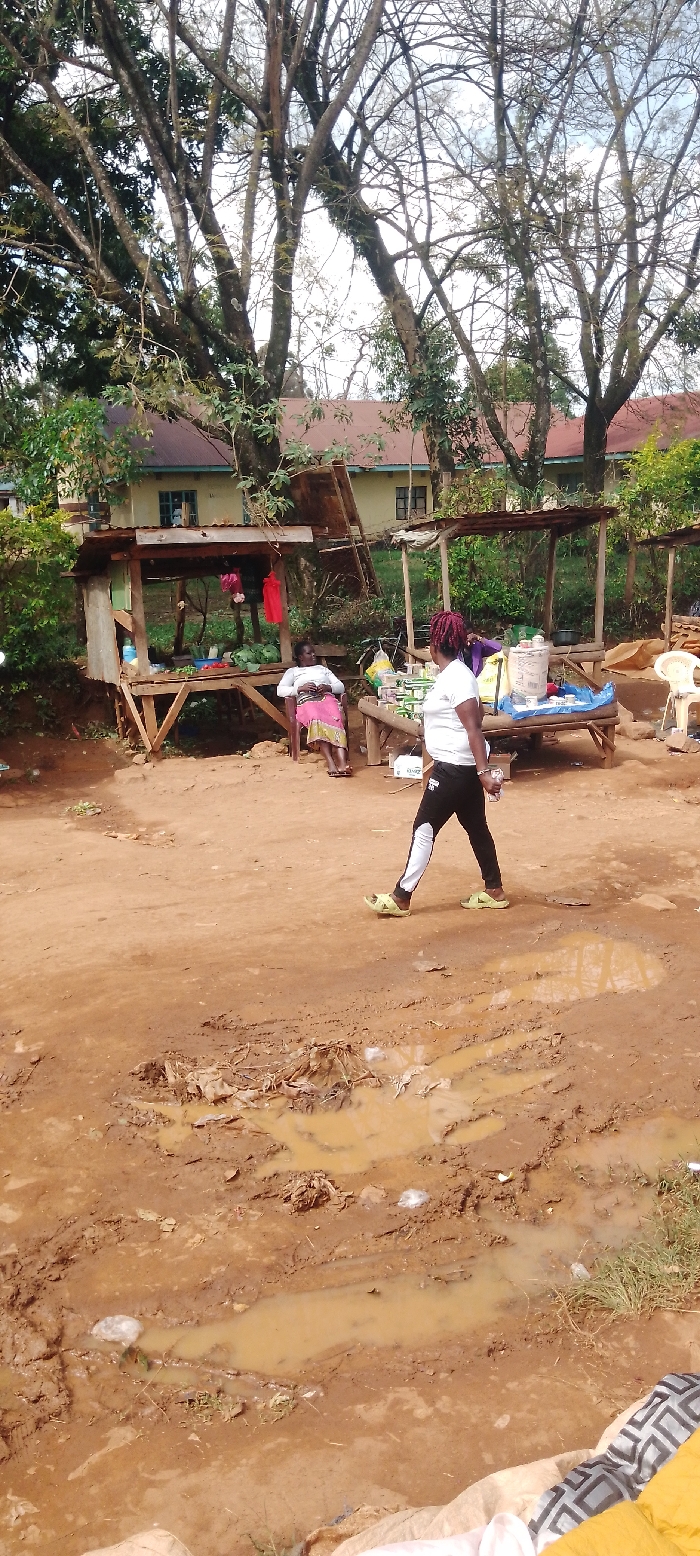 This image depicts an outdoor scene in Chevaywa ward, Kenya, characterized by an unpaved, reddish-brown dirt ground with multiple muddy puddles and scattered debris, including plastic items