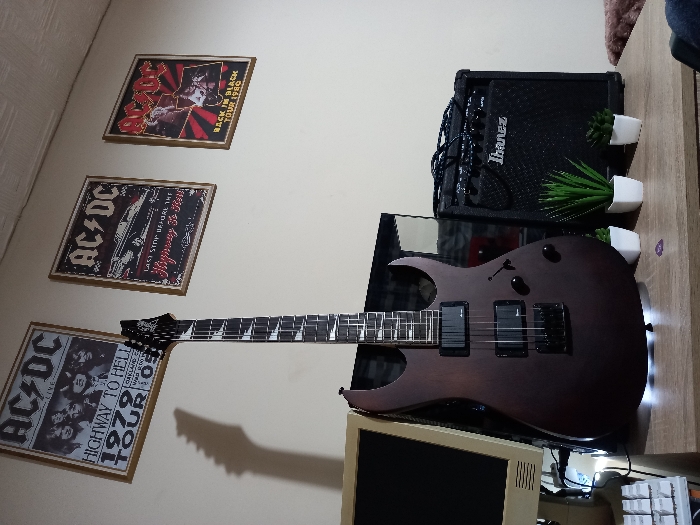 The image presents an indoor scene featuring musical instruments and memorabilia. The precise location in Reselets, Bulgaria, cannot be determined from the visual evidence. A dark brown, matte-finish electric guitar with black hardware, a black headstock, and a dark fretboard with white block inlays stands vertically on a light wooden surface. White ambient light emanates from beneath the guitar's body. To its immediate left, a beige CRT computer monitor is partially visible, with a white mechanical keyboard positioned below it. Behind the guitar, a large, reflective black flat-screen display is present. To the right of the guitar, a black Ibanez IBZ10G guitar amplifier rests on the wooden surface. Three small artificial plants in white cubic pots are arranged in front of the amplifier. A single purple guitar pick lies on the surface between the guitar and the plants. A section of light brown fabric and dark blue material is visible on the far right. The wall behind the objects is light-colored and features three framed AC/DC posters: "HIGHWAY TO HELL TOUR 1979" (left), a "Highway to Hell" themed poster with a car (center), and "BACK IN BLACK TOUR 1980" (right). A shadow of the guitar's headstock is cast on the wall to the left. The ceiling exhibits a textured finish.