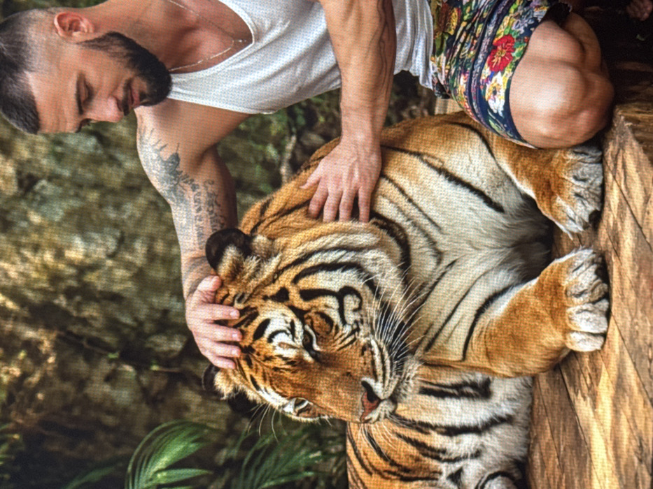 A male individual with short dark hair and a beard is depicted kneeling on a wooden platform. He wears a white tank top and multi-colored floral shorts. Tattoos are visible on his right arm. His hands are placed on a large tiger, which is lying prone on the same wooden platform. The tiger exhibits typical orange fur with black stripes. Its eyes are partially closed, and its head is turned slightly to the left. The man's gaze is directed towards the tiger. The background features dense green foliage and a textured rock face. The scene is located in Madzherito, Bulgaria.