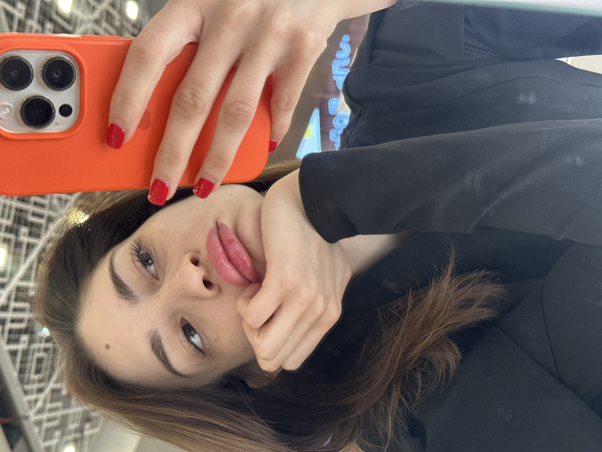 The image presents a mirror selfie of a young adult female captured indoors. The subject has long, brown hair parted down the middle, full eyebrows, and visible eyelashes. Her skin appears fair, with freckles and a small mole above her right eyebrow. Her full lips, colored with a pink product, are pursed in a slight pout. Her dark eyes are directed upwards and to the right. She wears a black garment, visible on her shoulders and chest. Her left hand, adorned with red nail polish, is positioned under her chin. Her right hand, also with red nail polish, holds an orange-cased smartphone with a triple-lens camera array, partially obscuring the right side of her face. The background, a reflection in the mirror, reveals a grid-patterned ceiling with integrated lighting fixtures, and below it, blurred illuminated signs featuring Cyrillic text, indicative of a commercial interior. The scene is located in Yekaterinburg, Russia.