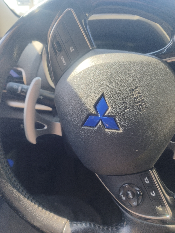 The image displays the interior of a vehicle, specifically focusing on the black, textured steering wheel. A prominent blue Mitsubishi three-diamond logo is centered on the airbag cover, beneath the embossed "SRS AIRBAG" text. The left spoke of the steering wheel features black control buttons including "CANCEL" and other functional icons, while a silver-colored paddle shifter is visible behind the steering wheel rim on the left side. The right spoke also contains black control buttons for media and phone functions, including volume, mode, and call management. Strong direct sunlight illuminates the upper right portion of the steering wheel and dashboard, creating a bright glare. The background is out of focus and overexposed, obscuring details beyond the immediate interior. No individuals or specific actions are depicted. The location in Sofia, Bulgaria, cannot be determined from the visual information provided within the image.
