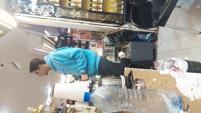 A person in a light blue hoodie and dark pants stands next to a table with various objects, including a large plastic bottle, a white container, and a metal object. They appear to be adjusting something on the table or examining the objects. In the background, a shop setting is visible with shelves filled with products, a chair, and other items stacked behind the person. A mirror reflects the scene, adding depth to the cluttered environment.