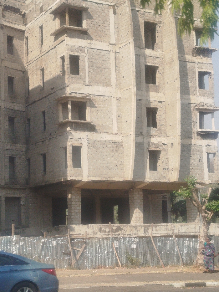 This image depicts a multi-story concrete block and reinforced concrete building under construction, located in Aso, Nigeria
