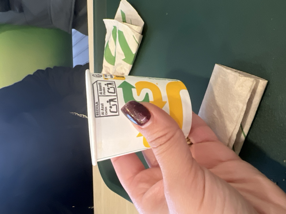 - "A close-up image depicts a person's left hand holding a small white paper cup in what appears to be a Subway restaurant located in Hérouville-Saint-Clair, France" by FM-RPGCC2, licensed under CC BY 4.0