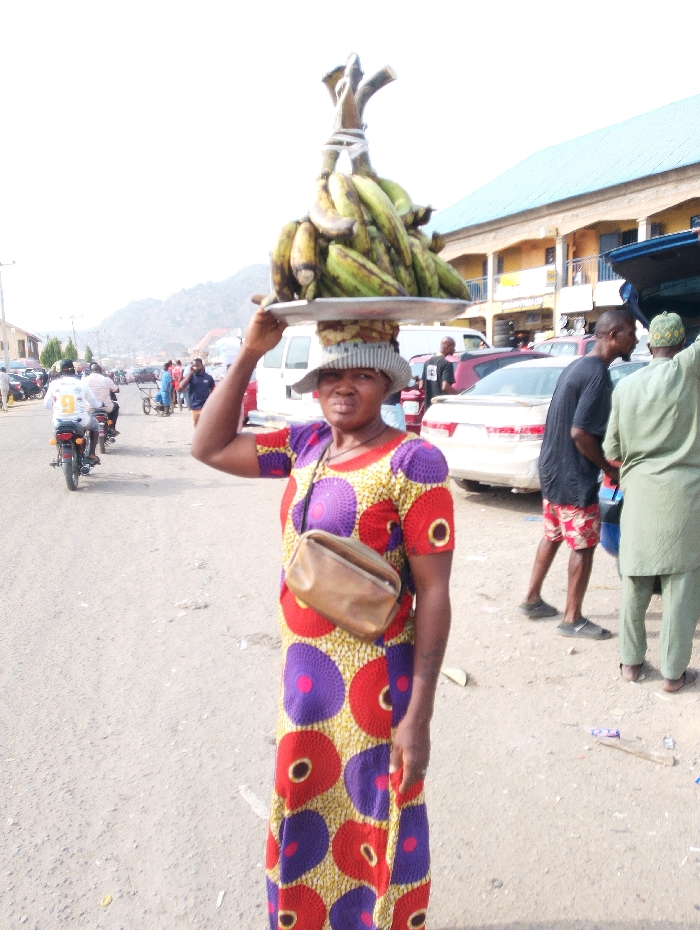 - "A woman balances a tray of green bananas on her head in a bustling outdoor setting" by FM-JRKle2, licensed under CC BY 4.0
