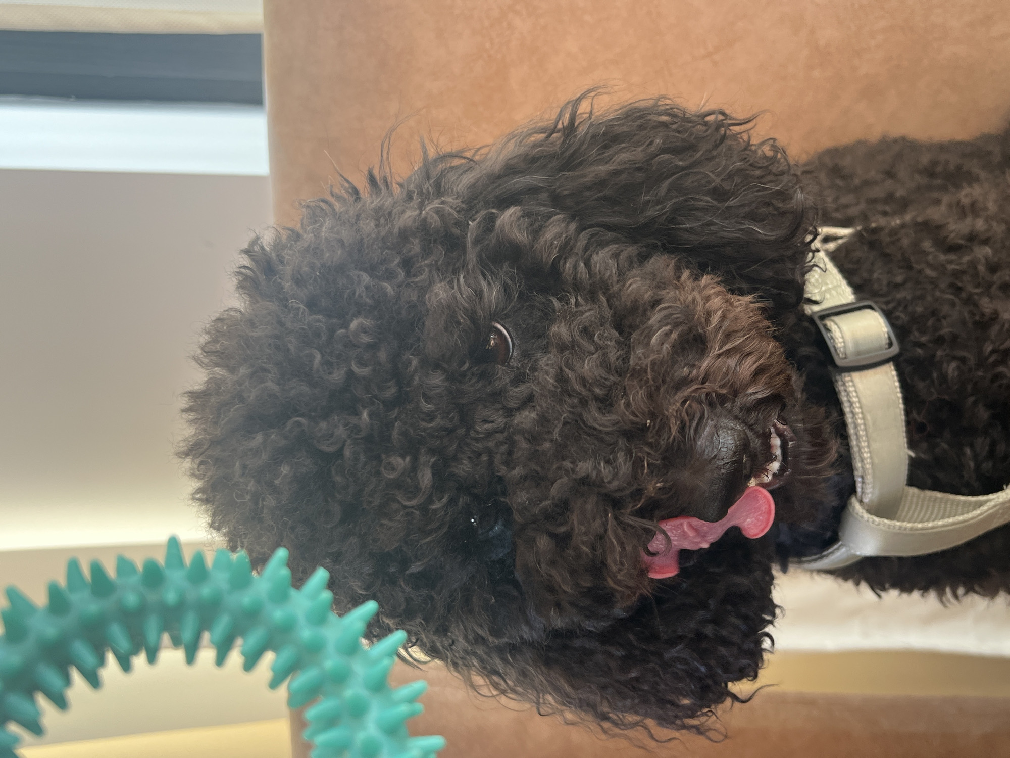 A close-up shot shows a brown poodle with curly fur, wearing a light gray harness. Its tongue is sticking out. Part of a teal-colored, spiky, ring-shaped dog toy is visible on the left. The background includes a window and a light brown surface. No people are visible. The location is unknown and there is no indication in the image that the location is Sofia, Bulgaria.