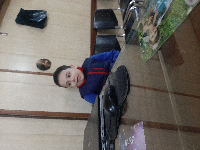 A young child, wearing a blue and red jacket, sits near a desk. On the desk, a computer mouse and keyboard are visible, along with a framed photograph. Behind the child, against a light-colored wall, a dark bag and a round object are seen. A row of dark chairs is partially visible in the background. The picture is taken at an angle.