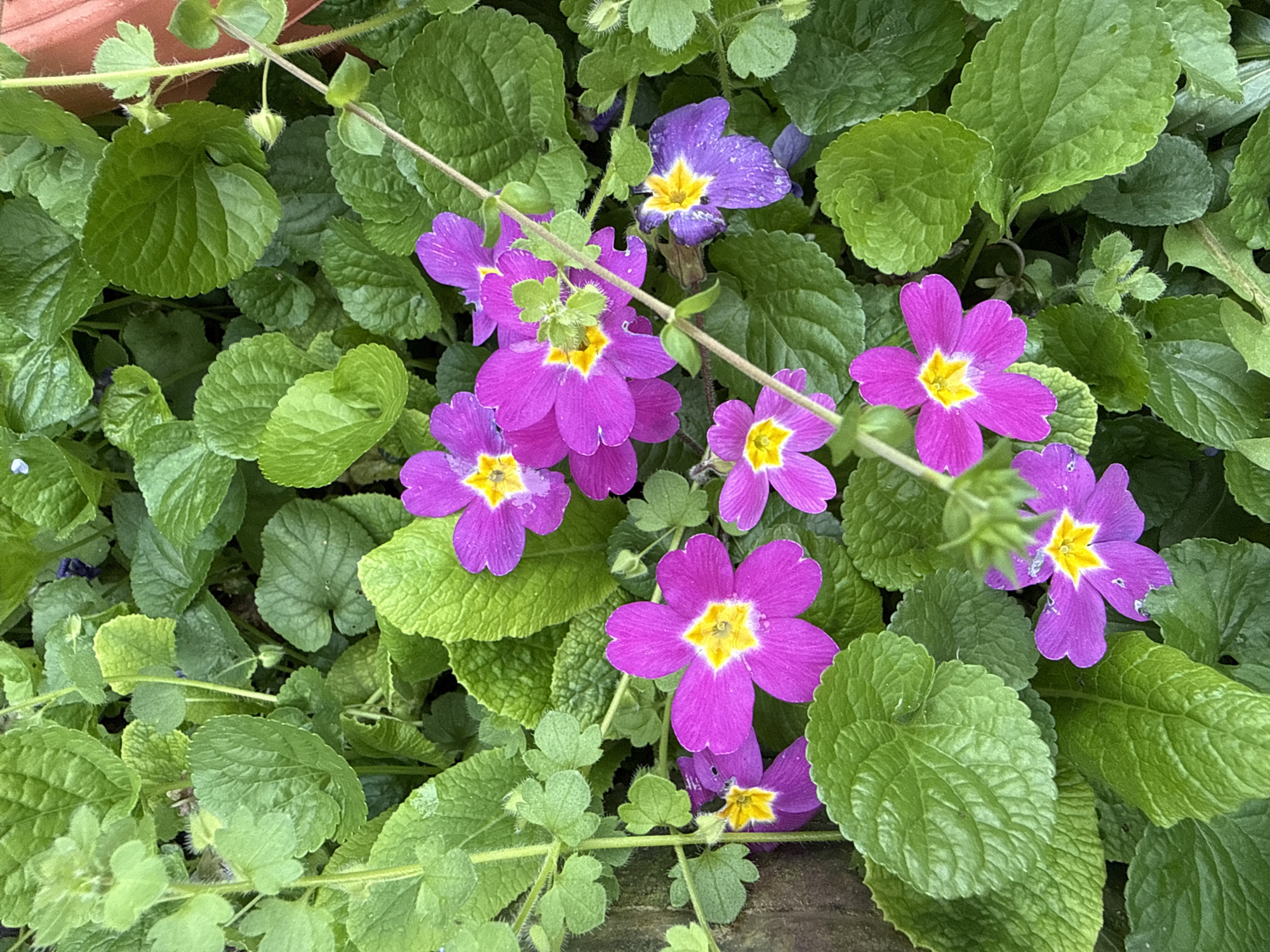 close-up of a patch of vibrant purple and yellow primrose flowers surrounded by lush green foliage