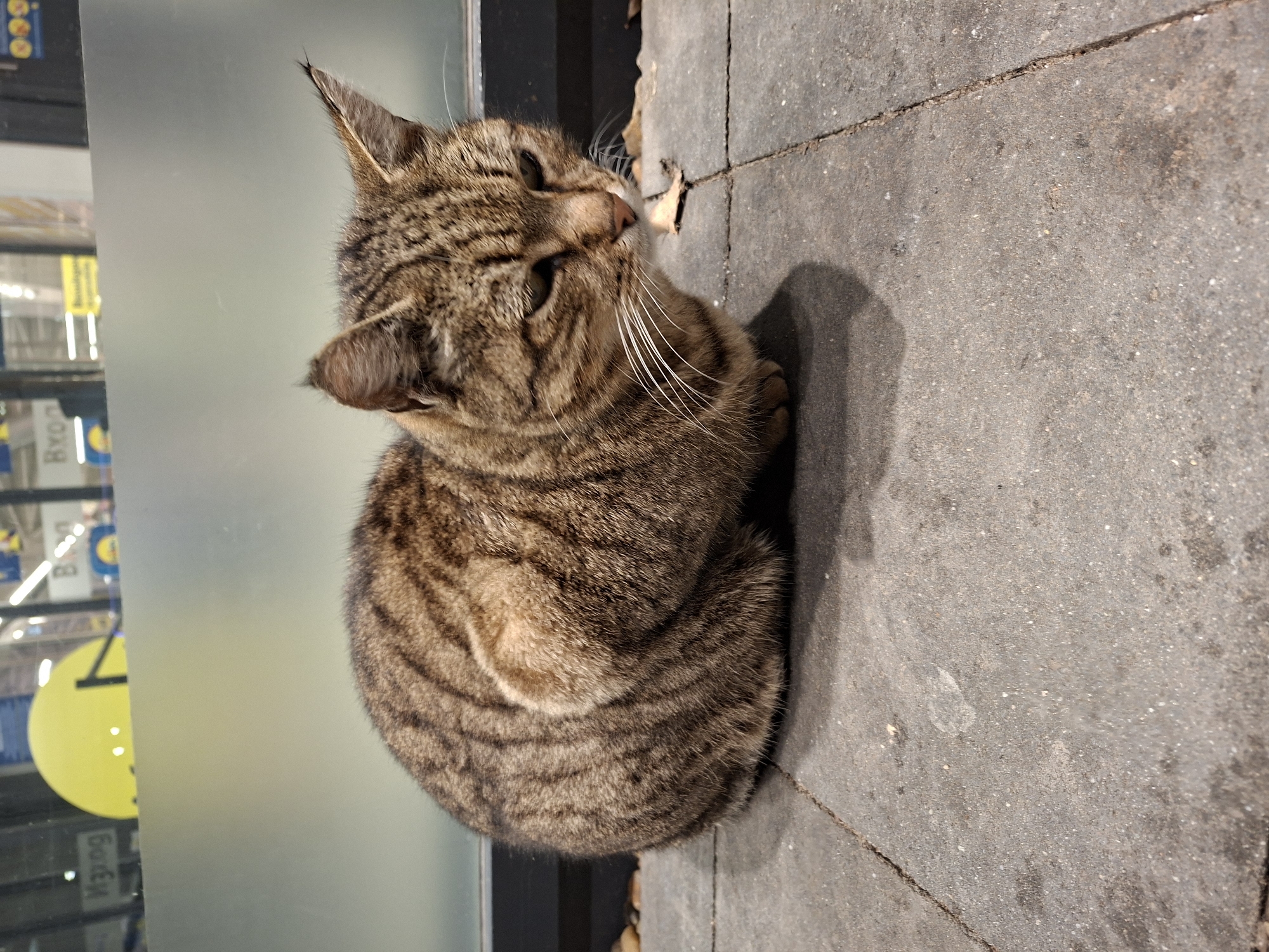 A domestic cat, exhibiting a brown tabby coat with prominent darker stripes and white whiskers, is positioned in a crouched or loaf-like posture on a surface of dark gray concrete pavers. Its eyes are partially narrowed and directed downwards. In the immediate background, a translucent glass panel is visible, behind which the blurred interior of a commercial establishment can be discerned. Reflected and mirrored details within the glass panel include distinct yellow and blue "Lidl" logos, yellow circular objects, and Cyrillic text, specifically "Вход" (Entrance). Interior lighting fixtures are also visible. Small, dried leaves are scattered on the ground near the cat, and a line of decorative pebbles runs along the base of the glass panel. This scene is located outside a Lidl supermarket in Shumen, Bulgaria.