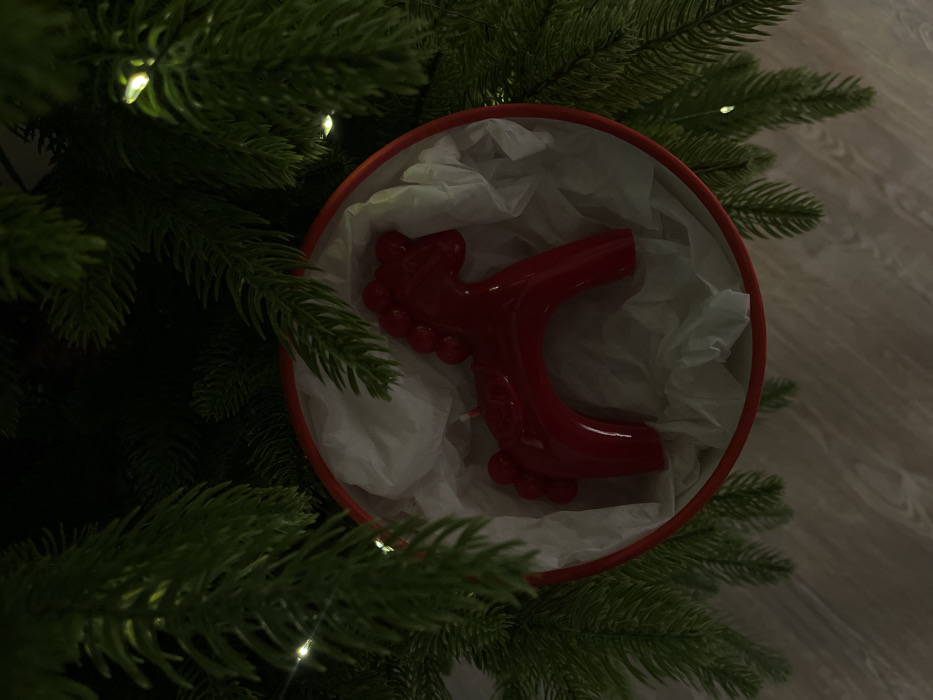 The image displays a red, horse-shaped candle resting within a round container with a red rim. The candle is positioned on a bed of crumpled white tissue paper inside the container. This container is situated amongst green artificial evergreen branches, which are subtly illuminated by several small, diffused white LED lights. The immediate background is dark, suggesting a low-light environment or deep recess. A light-colored, out-of-focus surface is visible below the evergreen branches. No individuals or specific identifying features of a city or country are present in the scene. The specific location within Krasnoyarsk, Russia, cannot be determined from the visual evidence.