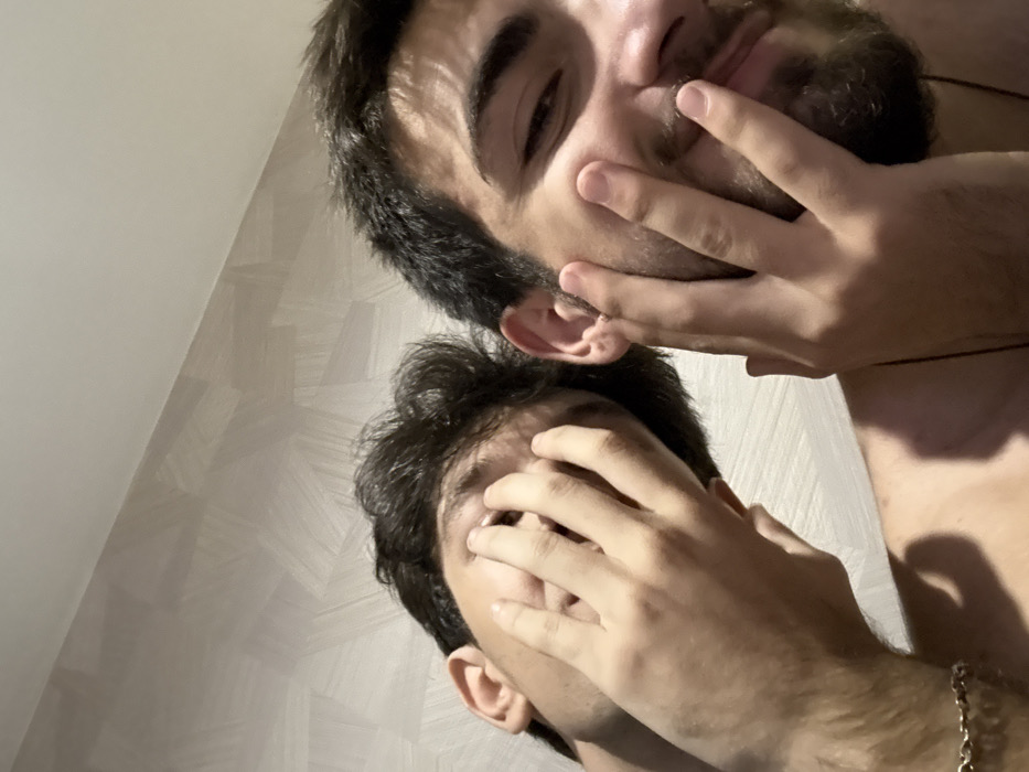 This image depicts two bare-chested male individuals in a close-up, indoor setting within the city of Tbilisi, Georgia. The background is a light-colored wall exhibiting a subtle, textured pattern. The individual positioned on the left has dark hair and his right hand is observed covering his eyes and upper face. A gold-colored chain bracelet is visible on his left wrist. The individual on the right has dark hair and facial stubble or a short beard. His right hand is pressed against his own left cheek, and he displays a partial smile. A thin, dark cord necklace is present around the right individual's neck. The lighting creates distinct shadows across their faces and bodies.