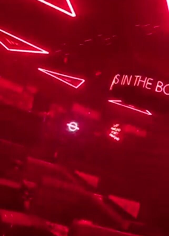 dimly lit room with red neon lights. The words "S IN THE BOX-WH" are written in neon lights, and there are triangle-shaped neon lights as well. Other objects and people in the room are visible in silhouette. The camera pans slightly, and there is a sound of music playing in the background.