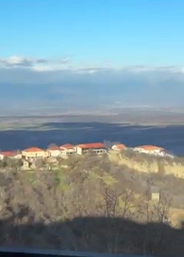 The camera pans slowly across a scenic view from a high vantage point. The foreground consists of a dark metal railing, hinting at a balcony or observation deck. Beyond the railing, a small village with terracotta-roofed buildings nestles on a hillside covered in sparse, winter foliage. The hillside descends to a broad, flat plain stretching towards the horizon. In the distance, a line of mountains is visible, their peaks capped with snow or clouds. The sky is a clear, bright blue, with a few scattered clouds. The overall impression is one of a vast, open landscape under a bright, sunny sky.