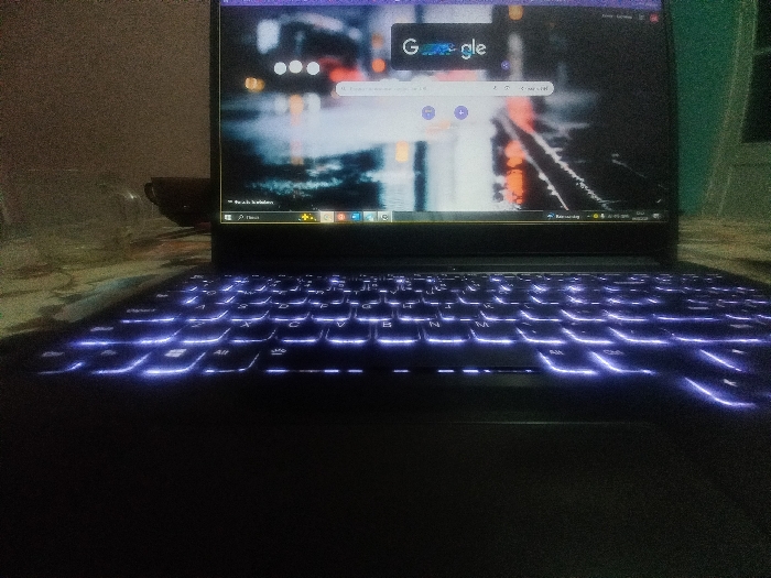 A close-up shot of a dark laptop with a glowing keyboard. The screen displays a Google search page with a rainy city scene as the background. Light from the keys illuminates the area around them. In the blurry background, a glass object and a cup are visible to the left of the laptop, and a white object is partially visible to the right.