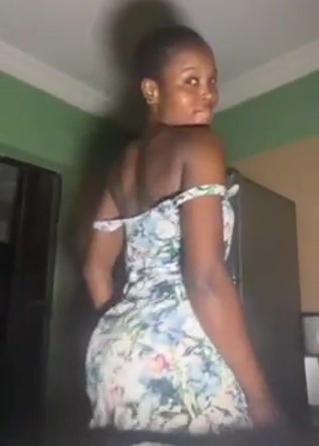 A young woman is standing and looking at the camera over her shoulder. She has dark skin, short black hair and is wearing a floral print dress that exposes her shoulders. She appears to be in a room with a grey refrigerator in the background. The room has green and tan walls, and there is a door in the background as well.