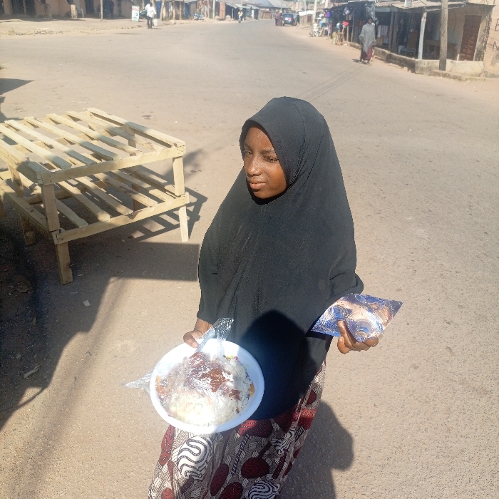 The image portrays an outdoor street scene in Jos, Nigeria. A female individual, appearing to be an adult, occupies the foreground, positioned slightly right of center. She wears a black hijab covering her head and torso, paired with a multi-patterned skirt or wrapper. Her gaze is directed towards the right. In her left hand, she holds a white, disposable round plate containing a meal, which is covered with a clear plastic film; the meal appears to consist of rice with a topping of sauce or stew. Her right hand holds a smaller, blue-patterned, plastic-wrapped item. To the left of the subject, a two-tiered wooden display stand, constructed from light-colored slats, rests on the ground. The background features a wide, unpaved or unevenly paved street, curving gently to the right. Both sides of the street are lined with single-story structures, consistent with shops or residences, many exhibiting signs of wear with partial facades and varied roofing materials. Several indistinct figures are visible walking along the street in the middle and far distance. The scene is brightly lit by natural daylight, producing distinct shadows, particularly from the wooden stand and the central figure.
