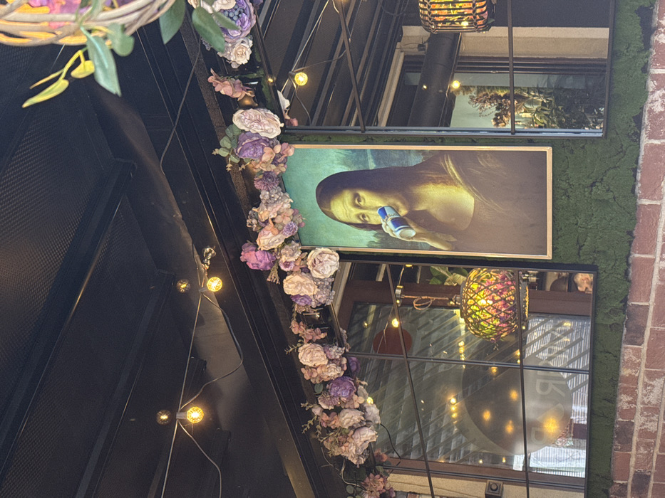 The scene is set within an indoor commercial establishment in Pleven, Bulgaria, likely a cafe or restaurant. A vertically oriented framed print of Leonardo da Vinci's Mona Lisa is centrally positioned. The artwork has been digitally altered to depict the Mona Lisa holding a blue and silver Red Bull energy drink can to her mouth, as if drinking from it. Above this print, a dense artificial floral garland in shades of purple, pink, and white extends horizontally across the upper portion of the wall. The ceiling is dark, possibly black, with visible structural elements and a grid of small, spherical incandescent lights emitting a warm yellow glow, strung on wires. Below the floral garland and adjacent to the Mona Lisa print, large rectangular reflective surfaces, appearing as mirrors or windows, show interior reflections of additional warm light sources and blurred elements of the room, including hints of other seating and patrons. One reflection distinctly shows a large circular light fixture. Two intricate, multi-colored glass lantern-style fixtures are suspended, one partially visible on the left reflecting in the mirror, and another on the right. Below the reflective surfaces, a strip of artificial green moss-like material covers a horizontal band, which in turn rests on a wall constructed from red brickwork. No direct human figures are clearly discernible, but reflections suggest an occupied space.