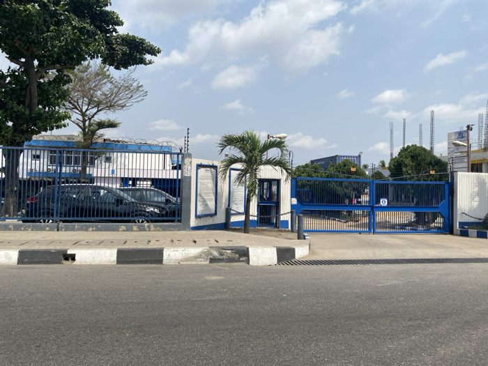 A street-level daylight photograph depicts the secured entrance to a facility in Akowonjo, Nigeria