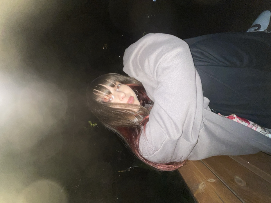 A girl with red-streaked brown hair, bangs, and silver hoop earrings lies on a wooden bench. She wears a gray hoodie pulled tightly around her face and dark pants. One foot with a gray and white shoe is visible. The image is dark, with a blurry, possibly wet, area in the background to her left. A dark body of water is behind her.