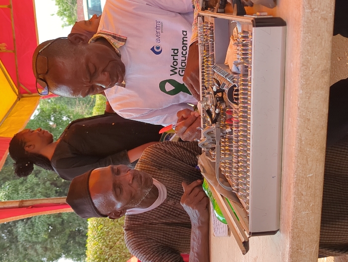 The scene is set outdoors in Unguwar Rimi, Nigeria, under a red and yellow canopy. Three individuals are visible, with a fourth partially obscured. In the foreground, two adult males are seated at a light-colored table. The male on the left, with dark skin and a short beard, wears a brown striped long-sleeved garment over a white undershirt and a dark skullcap. He looks downwards towards the table, with his hands resting near a green plastic bottle and a white rectangular object. The male on the right, also with dark skin, wears a white short-sleeved t-shirt featuring a green ribbon and "World Glaucoma" text, along with an "aventura provision" logo. He has black-framed sunglasses resting on his head and is holding a red-capped pen or stylus in his right hand, positioned over a large, open, light-colored rectangular kit on the table. This kit contains numerous small metallic tools or components arranged in rows. Both males appear focused on the contents of the kit. In the midground, to the left of the male in the white shirt, a female with dark skin and dark hair tied back stands, wearing a dark long-sleeved top. She is looking towards the viewer's left. A portion of another individual's face is visible in the background, to the right. Green foliage is visible beyond the canopy in the background.