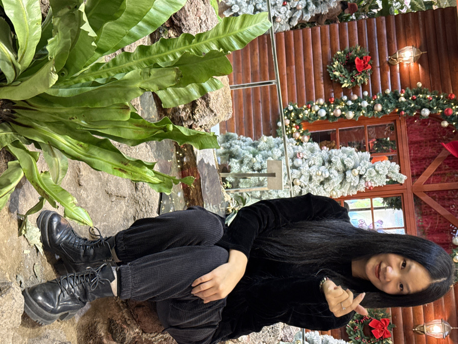 An East Asian female is seated on a multi-tiered artificial rock formation within a decorated indoor environment in Liangjiang, China. She wears a black long-sleeved velvet top, black corduroy-style joggers, and black lace-up combat boots. Her long, dark hair falls over her shoulders. She smiles towards the viewer, making a finger heart gesture with her right hand. In the lower left foreground, a large green Bird's Nest Fern, displaying some minor brown discoloration on its fronds, is prominent. The background features a rustic log cabin-style facade adorned with Christmas decorations, including green garlands with red and silver ornaments and lights, red bows, and wreaths. An antique-style wall sconce is affixed to the log wall. Two frosted Christmas trees, decorated with lights and ornaments, are positioned behind a silver metal railing. A red-framed window is visible on the cabin facade.